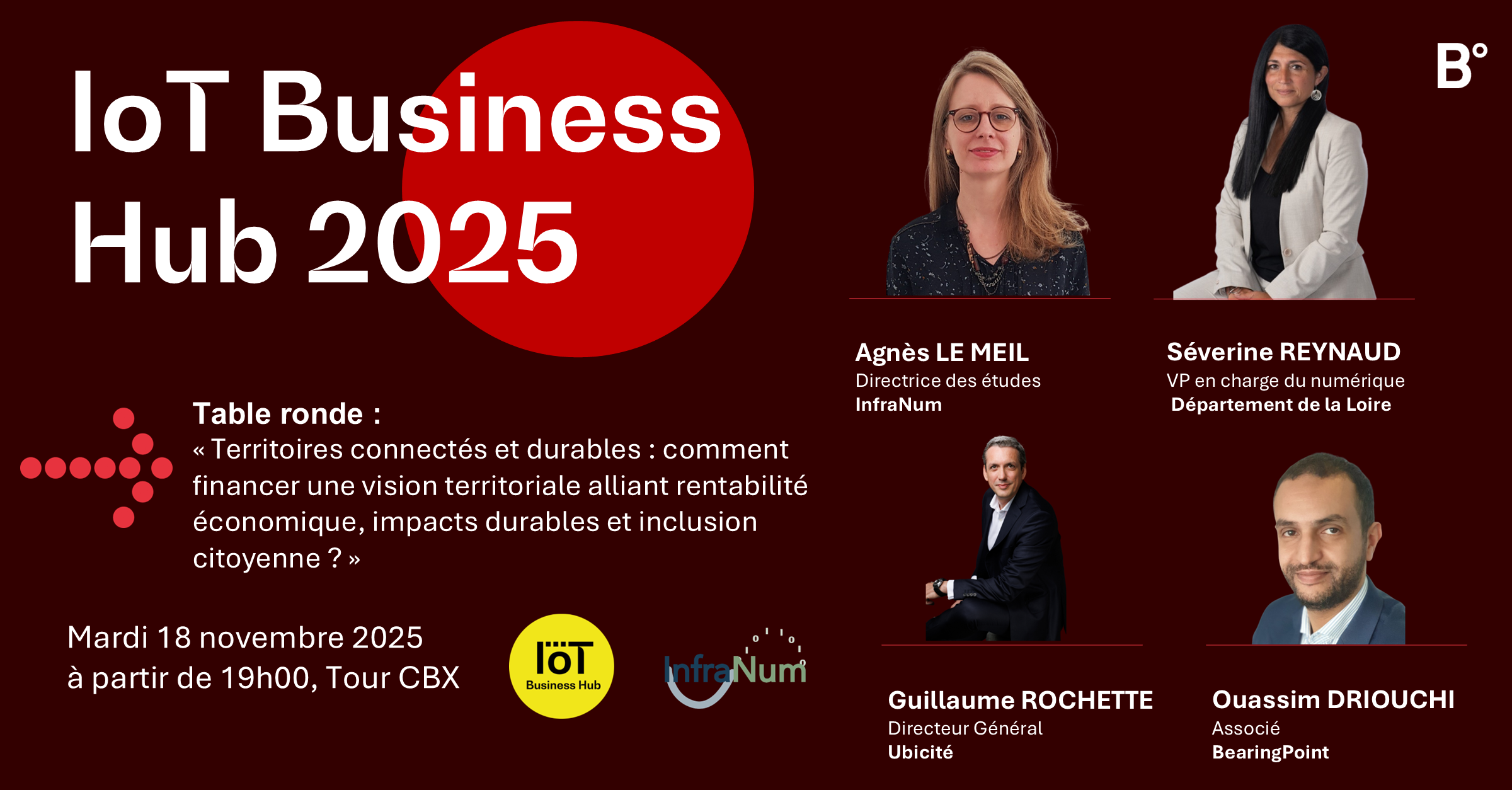 Pour sa septième édition et en partenariat avec InfraNum, BearingPoint a le plaisir de vous convier à son événement annuel de décryptage de la transformation IoT, en présence de Madame Prisca Thévenot.